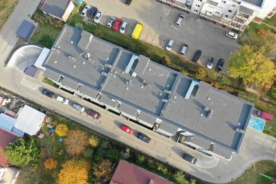 Zakres prac obejmował: stan surowy, roboty ziemne, fundamenty, ściany, mury oporowe, kominy, schody, szachty windowe, przyłącza (wody), kanalizacji, sanitarnej, deszczowej, ciepłownicze, gazowe i elektryczne, instalacje wewnętrzne (wentylacji, c.o, elektrycznej, teletechnicznej, wod.-kan., węzła cieplnego), wykończenie (elewacja, balustrady, posadzki, stolarka okienna i drzwiowa, brama wjazdowa, ogrodzenie, zadaszenie rampy, dostawa i montaż urządzeń dźwigowych), ocieplenie stropu garażu, wiata śmietnikowa, zagospodarowanie terenu.